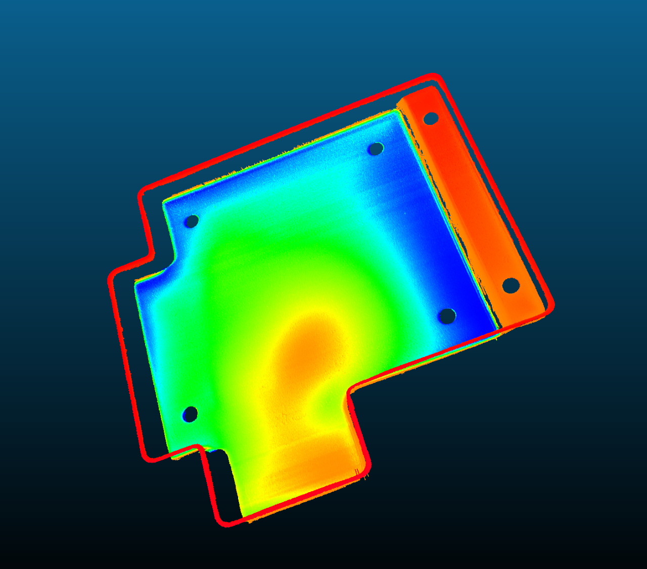 深视智能SR8060三维激光轮廓测量仪通过三维激光扫描技术,对屏蔽罩安装面进行全区域3D扫描,获取高密度点云数据;系统基于最小二乘法自动拟合空间基准平面,通过计算各测量点到拟合平面的距离,以距离最大值与最小值的差值作为平面度检测结果,全面精准反映安装面的平面度偏差。