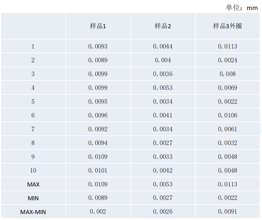 基于摄像头平面度重复精度10μm的测试需求,SGI030激光位移传感器在测试使用10kHz采样频率,经过10次动态测量,获取的平面度重复性最大值为0.0091mm,测试结果符合生产要求。