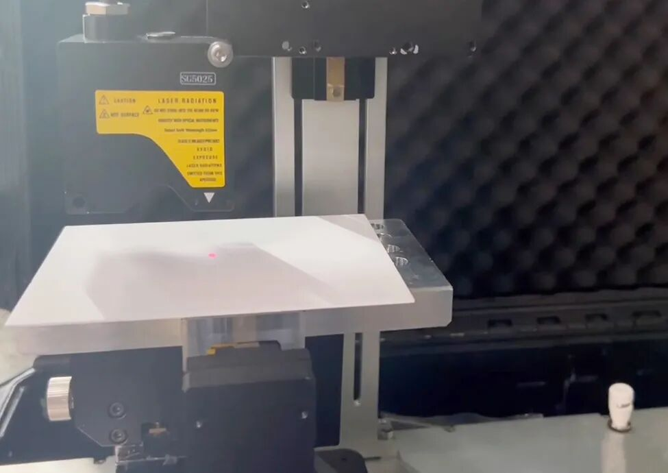 陶瓷片的厚度测量采用传感器上下对射的方式,使用SG系列点激光同步连续采集检测数据,通过网口通讯,将测厚值发送给上位机并测试不同位置的点数据,而上位机则可通过判断陶瓷片的厚度区分NG料。