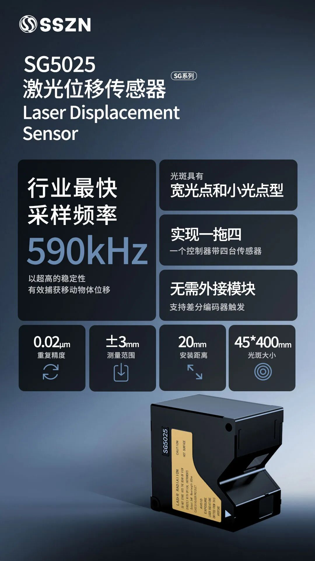深视智能SG系列激光位移传感器拥有590kHz的行业内先进的快速采样频率,具备超高的稳定性和重复精度,广泛应用于锂电、半导体、电子元件、薄膜塑胶等领域。
