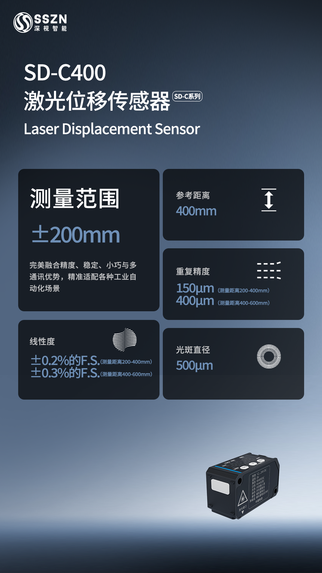 深视智能SD-C400激光位移传感器测量范围±200mm,重复精度可达0.15mm,采样频率可达1kHz,能实时检测物体表面的微小位移和深度变化,在激光打标中可实现精准定位,确保打标图案或文字的位置、深度准确无误。