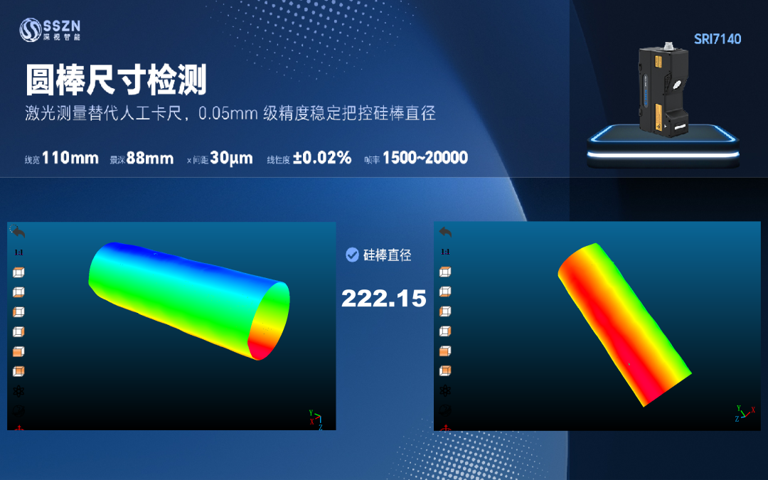 深视智能三维激光轮廓测量仪SRI7140具备70-110mm可调扫描宽度,适配不同规格的硅棒;线性度高达±0.02%F.S.,确保测量结果稳定可靠;配合1500-20000kHz的扫描速度在高速运行中仍保持优异表现,项目综合精度可达0.05mm。